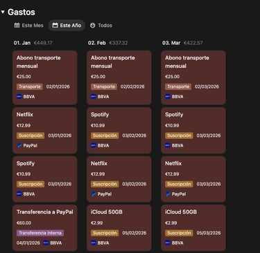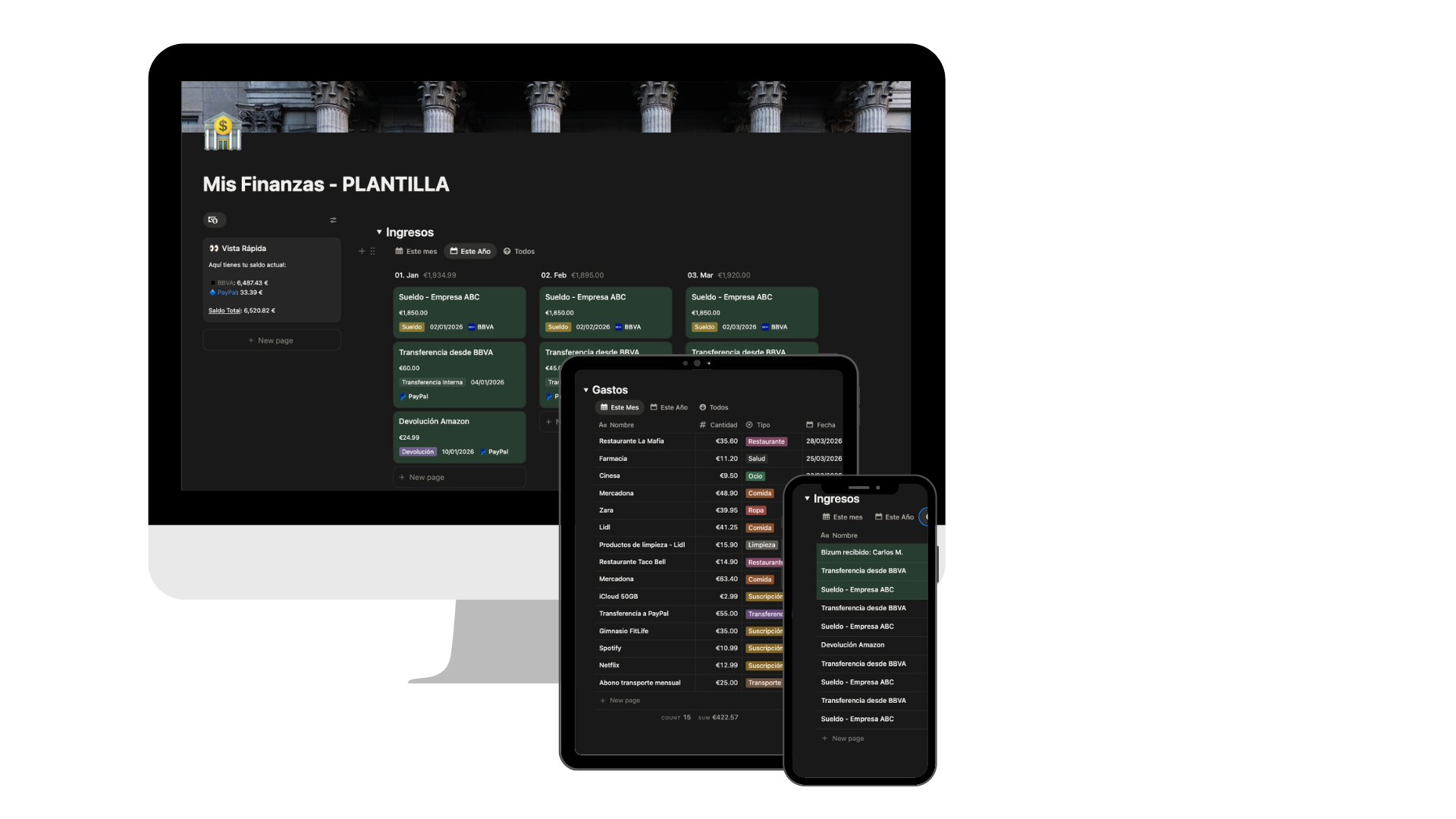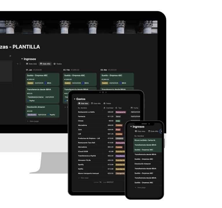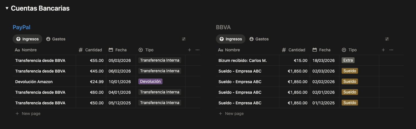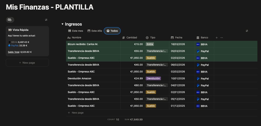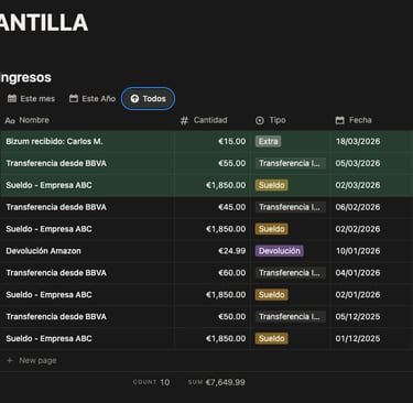 Tu sistema completo en Notion para registrar ingresos y gastos, organizarlos por cuenta bancaria y ver tu situación económica de un vistazo.